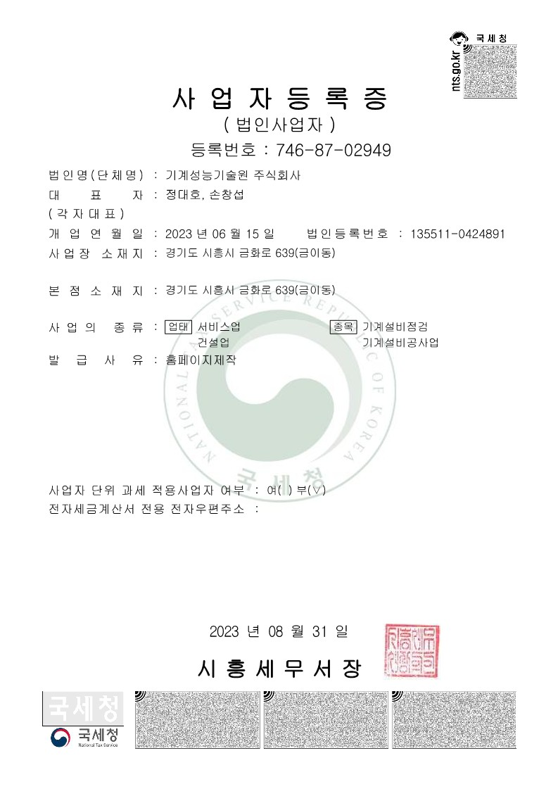 ![]() | 사업자등록증 - 사업자등록번호 : 746-87-02949 - 대표자 : 정대호, 손창섭 - 개업년월일 : 2023년06월15일 - 법인등록번호 : 135511-0424891 - 본점소재지 : 경기도 시흥시 금화료 639(금이동) - 발급기관 : 시흥세무소 | ||