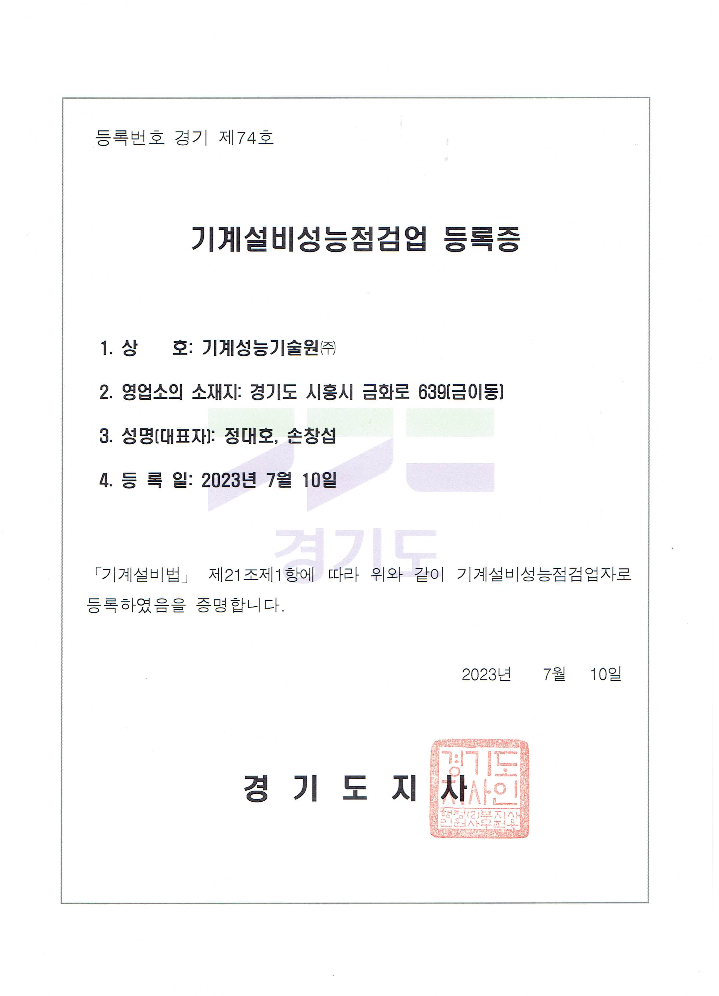 ![]() | 기계설비성능점검업 등록증 - 상호 : 기계성능기술원(주) - 등록번호 : 경기 제74호 - 영업소의 소재지 : 경기도 시흥시 금화료 639(금이동) - 성명(대표자) : 정대호, 손창섭 - 등록일 : 2023년 7월 10일 - 발급기관 : 경기도지사 | ||